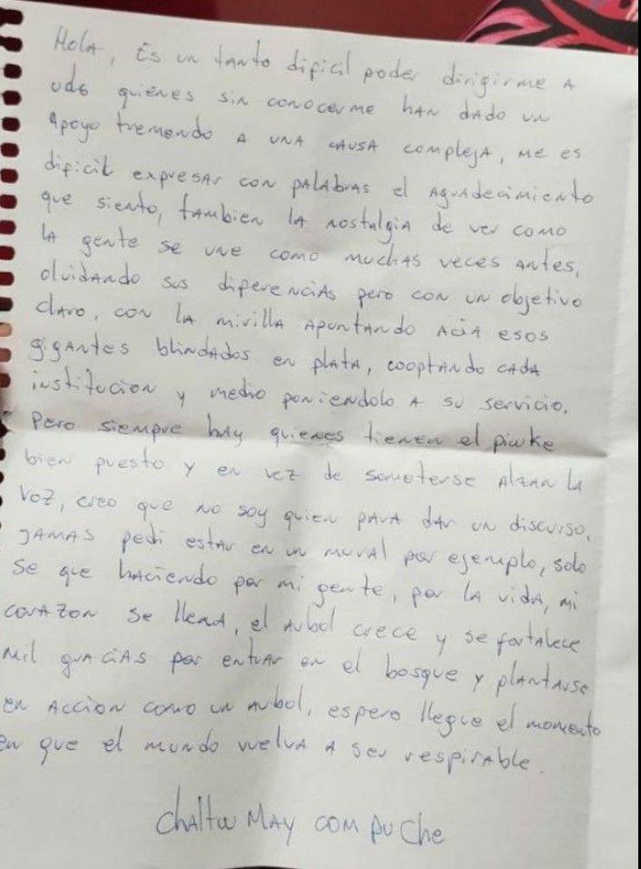 Esteban, desde su celda, engrillado, con su cuerpo debilitado, logra escribir algunas líneas que se explican por su fortaleza ideológica y espiritual. Estas caen sobre la vergüenza de los cobardes e interesados y alimenta la rebeldía de los pueblos: “Me es difícil expresar con palabras el agradecimiento que siento, también nostalgia por ver cómo la gente se une, como muchas veces antes, olvidando sus diferencias, pero con un objetivo claro, con la mirilla apuntando a esos gigantes blindados de plata”.